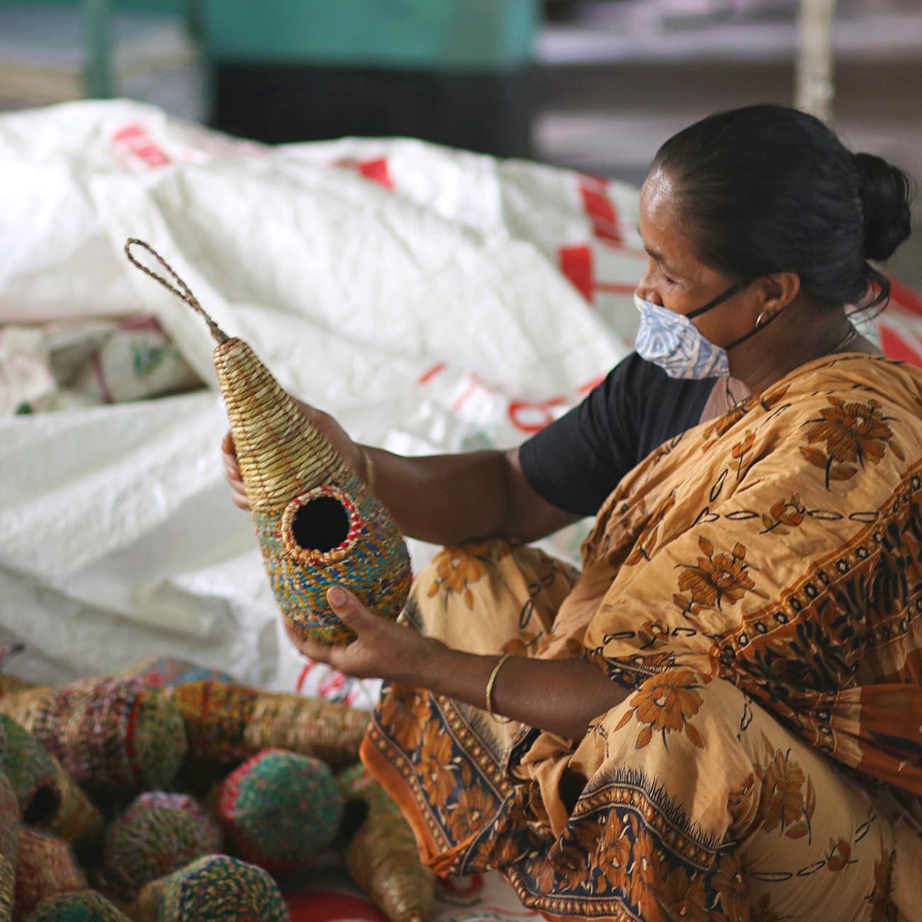 Without any use of plastic, the nests are woven from seaweed with a close mesh and then waxed to make them water-repellent. Partially made with strips of colorful saris, each weave has a very individual, different colored pattern. The colors and designs of the saris used are always slightly different: each nest has a unique character.