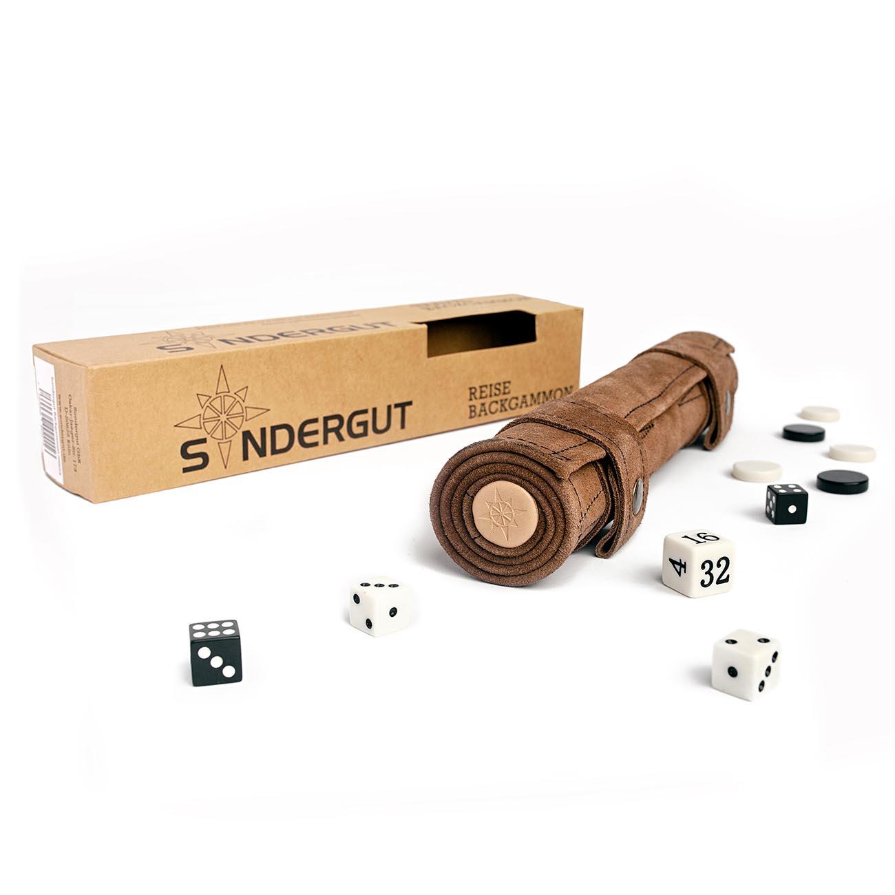 The backgammon game has points made of black and natural-colored synthetic leather, which are clearly visible (and pleasant to the touch) against the velvety soft, mocha-brown suede. With 2 x 15 pieces, pairs of dice and doubling dice.